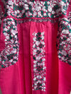 Vestido bordado a mano con hilo de seda multicolor sobre tejido azul de la máxima calidad, la caída de las telas de nuestros sanantoninos es maravillosa y consigue resaltar la belleza natural de cada mujer.