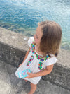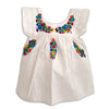 Precioso vestido de algodón crudo cuajado de frutas multicolores bordadas a mano en el canesú, el vuelo de la falta y...