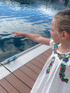 Precioso vestido de algodón rosa fresa cuajado de barquitos multicolores bordados a mano en el canesú, el vuelo de la falta...