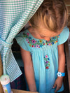 Precioso vestido de algodón azul agua cuajado de flores multicolores bordados a mano en el canesú, el vuelo de la...