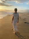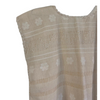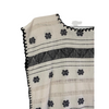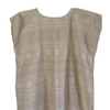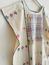 Delicado huipil con base cruda y bordados contraste en blanco, motivos geométricos y florales y pespunte vertical a tono. Realizados en...